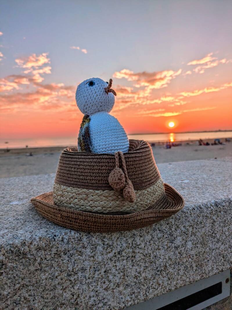 C'est l'heure de la sieste sur la plage de Monsieur Hulot. Tous les bécasseaux se reposent. Tous sauf deux ! Sanderling et Petit Cousin ont très envie d'aller voir ce grand bonhomme vert qui regarde l'horizon. Comme il est bizarre ! Curieux, les deux bécasseaux partent à l'aventure